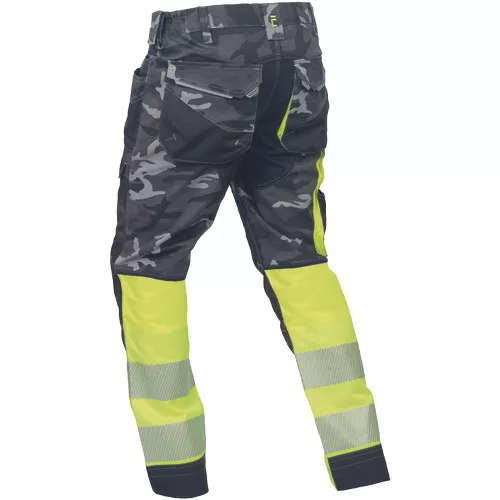 • férfi jólláthatósági nadrág rugalmas derékkal és többfunkciós zsebekkel, fényvisszavető elemekkel és 7 cm-es szegmentált fényvisszavető csíkokkal • megerősített térdrész és térdzseb Oxford 600D anyagból térdvédő behelyezéséhez • ellenálló hármas fedőző varrás az üleprészen és a meghosszabítható szárakon • modern terepminta