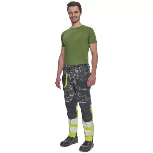 • férfi jólláthatósági nadrág rugalmas derékkal és többfunkciós zsebekkel, fényvisszavető elemekkel és 7 cm-es szegmentált fényvisszavető csíkokkal • megerősített térdrész és térdzseb Oxford 600D anyagból térdvédő behelyezéséhez • ellenálló hármas fedőző varrás az üleprészen és a meghosszabítható szárakon • modern terepminta