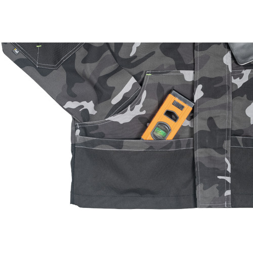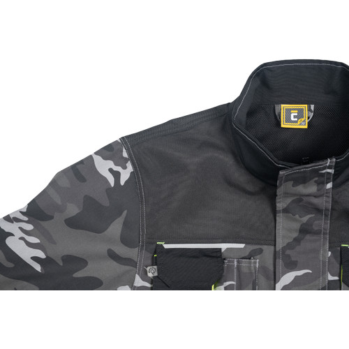 • férfi munkakabát • cipzárral záródó kabát tépőzáras hajtókával • Oxford 600D megerősítő rátétekkel a váll-és könyökrészeken • 2-2 oldal - és mellzsebbel, 1 e-Secure anyagból készült telefontartó zsebbel • fényvisszavető elemek, kontrasztos tűzés • modern terepminta