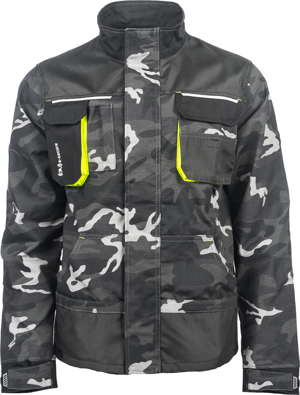 • férfi munkakabát • cipzárral záródó kabát tépőzáras hajtókával • Oxford 600D megerősítő rátétekkel a váll-és könyökrészeken • 2-2 oldal - és mellzsebbel, 1 e-Secure anyagból készült telefontartó zsebbel • fényvisszavető elemek, kontrasztos tűzés • modern terepminta