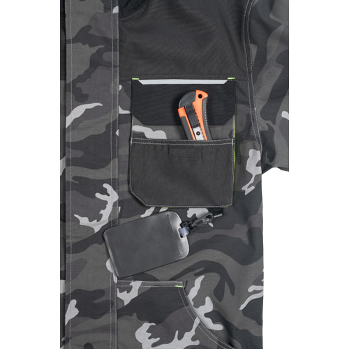 • férfi munkakabát • cipzárral záródó kabát tépőzáras hajtókával • Oxford 600D megerősítő rátétekkel a váll-és könyökrészeken • 2-2 oldal - és mellzsebbel, 1 e-Secure anyagból készült telefontartó zsebbel • fényvisszavető elemek, kontrasztos tűzés • modern terepminta