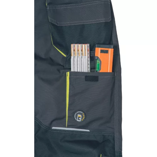 • Férfi jólláthatósági nadrág rugalmas derékkal és többfunkciós zsebekkel, 7 cm-es szegmentált fényvisszavető csíkokkal. Megerősített térdrész és térdzseb Oxford 600D anyagból térdvédő behelyezéséhez. Ellenálló hármas fedőző varrás az üleprészen és a meghosszabbítható szárakon.