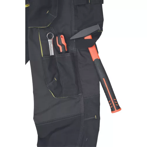 • Férfi jólláthatósági nadrág rugalmas derékkal és többfunkciós zsebekkel, 7 cm-es szegmentált fényvisszavető csíkokkal. Megerősített térdrész és térdzseb Oxford 600D anyagból térdvédő behelyezéséhez. Ellenálló hármas fedőző varrás az üleprészen és a meghosszabbítható szárakon.