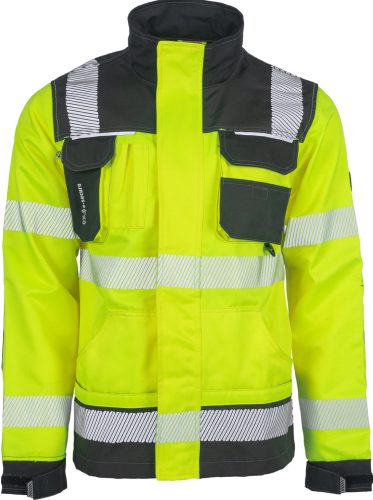 • férfi jólláthatósági munkakabát • cipzárral záródó kialakítás tépőzáras hajtókával, Oxford 600D megerősítő rátétekkel a váll-és könyökrészeken • 2-2 oldal - és mellzsebbel, 1 e-Secure anyagból készült telefontartó zsebbel • fényvisszavető részletekkel • 5 cm -es fényvisszavető csíkokkal a derékrészen, az ujjakon és a vállakon