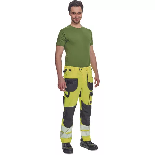• férfi jólláthatósági nadrág rugalmas derékkal és többfunkciós zsebekkel, 7 cm-es nyomtatott fényvisszavető csíkokkal • megerősített térdrész és térdzseb Oxford 600D anyagból térdvédő behelyezéséhez • ellenálló hármas fedőző varrás az üleprészen és a meghosszabbítható szárakon