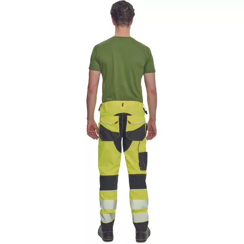 • férfi jólláthatósági nadrág rugalmas derékkal és többfunkciós zsebekkel, 7 cm-es nyomtatott fényvisszavető csíkokkal • megerősített térdrész és térdzseb Oxford 600D anyagból térdvédő behelyezéséhez • ellenálló hármas fedőző varrás az üleprészen és a meghosszabbítható szárakon