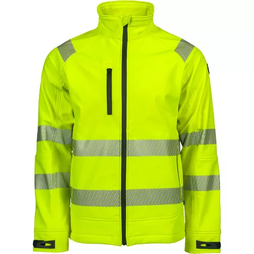 Férfi jólláthatósági softshell dzseki membránnal és polár béléssel, 2 cipzáras oldalzsebbel, 1 mellzsebbel, 3 többfunkciós belső zsebbel. 2 db 5 cm-es szegmentált fényvisszavető csík a derékrészen, az ujjakon és a vállakon. Tépőzárral állítható mandzsetta. Dekoratív részletek és varrás kontrasztos színekben.