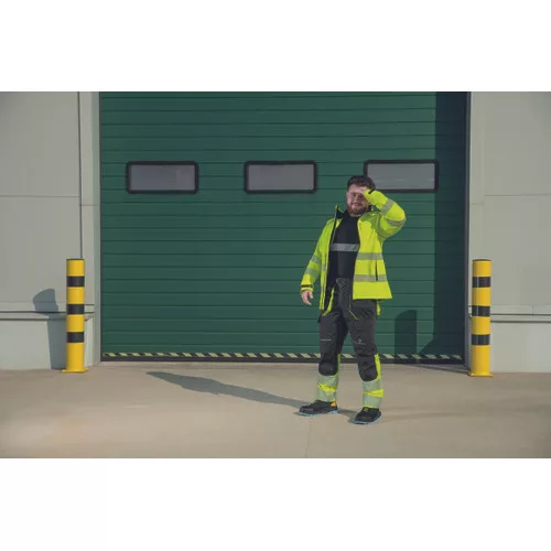 Férfi jólláthatósági softshell dzseki membránnal és polár béléssel, 2 cipzáras oldalzsebbel, 1 mellzsebbel, 3 többfunkciós belső zsebbel. 2 db 5 cm-es szegmentált fényvisszavető csík a derékrészen, az ujjakon és a vállakon. Tépőzárral állítható mandzsetta. Dekoratív részletek és varrás kontrasztos színekben.