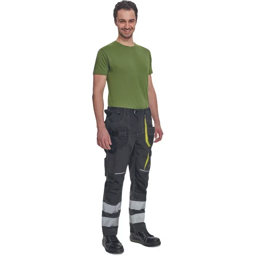 • férfi nadrág rugalmas derékkal és többfunkciós zsebekkel, 7 cm-es szegmentált fényvisszavető csíkokkal • megerősített térdrész és térdzseb Oxford 600D anyagból térdvédő behelyezéséhez • ellenálló hármas fedőző varrás az üleprészen és a meghosszabítható szárakon