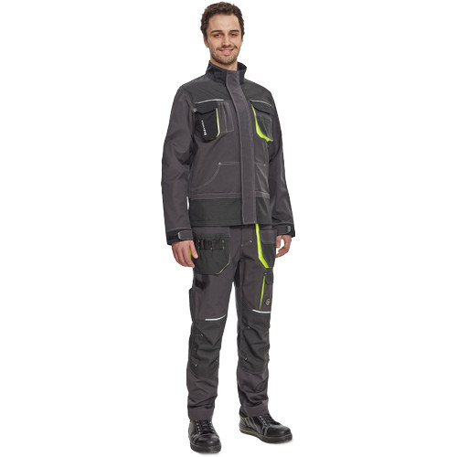 Férfi munkakabát. Cipzárral záródó kabát tépőzáras hajtókával, Oxford 600D megerősítő rátétekkel a váll-és könyökrészeken. 2-2 oldal - és mellzsebbel, 1 e-Secure anyagból készült telefontartó zsebbel. Fényvisszavető elemekkel, kontrasztos varrással.