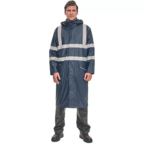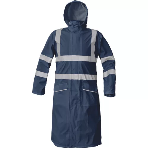 • víz-és szélálló, bő szabású esőköpeny gallérba hajtott kapucnival • hossza: 120 cm • húzózsinórral állítható kapucnival • 2 mély zsebfedős oldalzseb • patenttal szűkíthető mandzsetták • fényvisszavető csíkok az ujjakon, a vállakon és a test körül