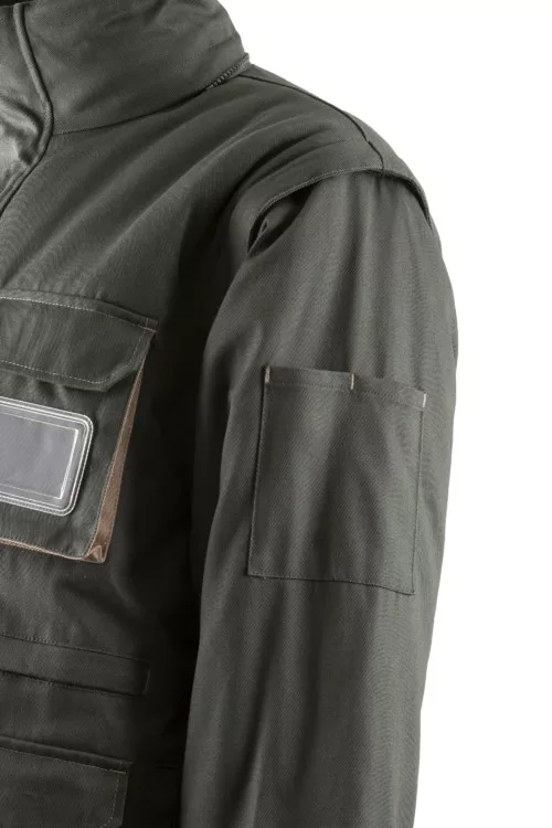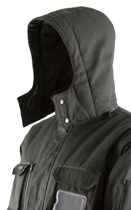* Twill (sávoly szövés): 100% pamut 300 g/m2 + meleg bélés 220 g/m2 + bélés 80% poliészter / 20% pamut 105 g/m2* 9 zseb * cipzár tépőzáras fedéssel egészen az álló gallér tetejéig * levehető ujjak és bélelt kapucni * állítható tépőzáras mandzsetta * szitázható, D-gyűrű * kontrasztos színű betétek * Regular fitEN 14058