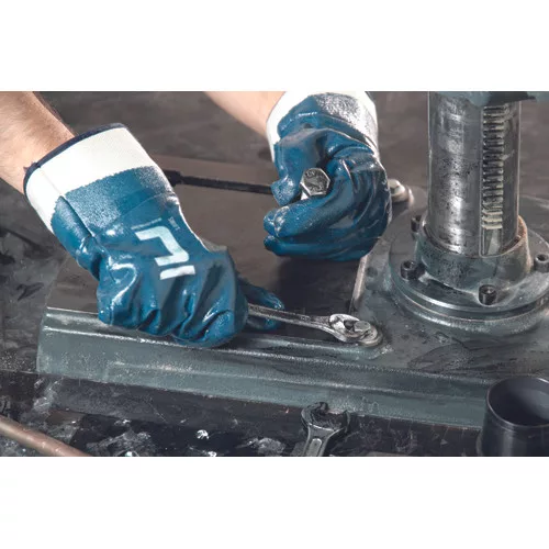 • kötött pamutkelméből varrt, nitrilbe teljesen mártott kék kesztyű merev mandzsettával