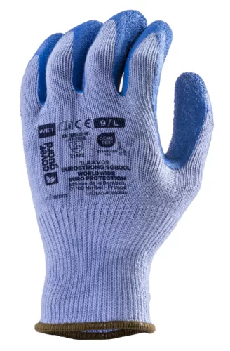 Kék, varrás nélküli, poliészterrel megerősített, 10-es kötésű kesztyű, kötött mandzsettával.Kék, érdesített latex mártás a tenyéren.OEKO-TEX® STANDARD 100 minősítés, CQ 1301/1, IFTH