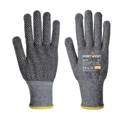 Prémium minőségű vágásbiztos kesztyű PVC pontozással. D szintű vágásbiztosságot garantáló, kiváló fogásbiztossággal rendelkező, felső kategóriás kesztyű megoldás éles tárgyak kezeléséhez.