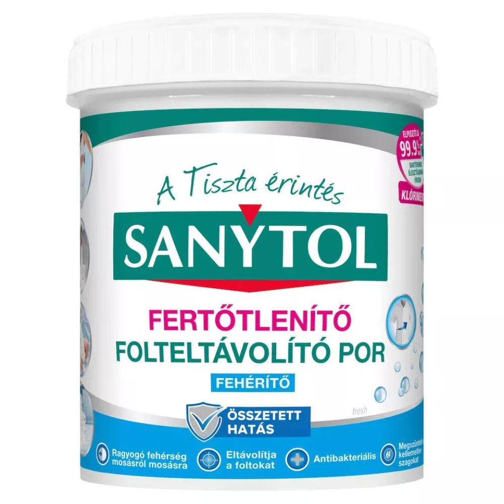 A Sanytol fertőtlenítő folteltávolító fehérítő por hatékonyan távolítja el a makacs foltokat és elpusztítja a baktériumok 99,9%-át. Ideális választás a fehér ruhák tisztításához és fertőtlenítéséhez.