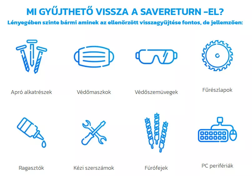 A SaveReturn egy automatizált visszagyűjtő rendszer, amely lehetővé teszi a használt munkavédelmi eszközök, kesztyűk, maszkok, szemüvegek, szerszámok és alkatrészek kontrollált leadását. A rendszer minden visszahozott termékről rögzíti a felhasználót, az időpontot, és igény esetén fotót is készít az állapot dokumentálására. Beállítható, hogy új termék csak akkor legyen kiadható, ha a korábban használt eszköz visszavételre került. Három külön gyűjtési kategória kezelhető: újrahasználható, selejt és veszélyes hulladék. A SaveReturn teljes mértékben integrálható a SavePro, SaveSpring és SaveBox rendszerekkel, így zárt eszközciklus valósítható meg.