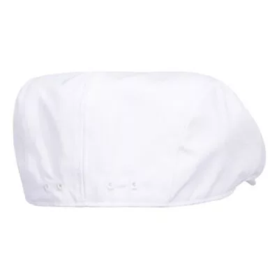 Stílusos séfek lapos sapkája lekerekített kialakítással és kis merev karimával. Nagyon kényelmes viselet a forró konyhában a könnyebb alapanyagunknak és a hátul lévő szellőzőnyílásoknak köszönhetően.