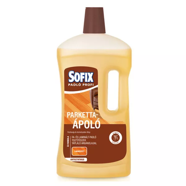 Sofix parkettaápoló tápláló argánolajjal. Fa- és laminált padló tisztítószer. Az új koncentrált formula a laminált felületeket ápolja, könnyen eltávolítja a port és szennyeződéseket, a padlót ragyogóan tisztán hagyva. Antisztatikus és polírozó tulajdonságokkal rendelkezik.Összetevők:<5% anionos felületaktív anyag, <5% nem anionos felületaktív anyag, <5% amfoter felületaktív anyagok, illatszerek, tartósítószer (benzisotiazolinone, sodium pyrithione), 1,2-benzisotiazol-3(2H)-on-t tartalmaz. Allergiás reakciót válthat ki.Használati utasítás:Hígítsunk 2 kupak folyadékot 5 liter meleg vízben. Az oldattal mossuk le a felületet, azonban a túlzott áztatást kerüljük. Öblítést nem igényel.Biztonsági figyelmeztetés:Gyermekektől elzárva tartandó.Tárolás:Hőforrásoktól, sugárzástól, statikus elektromosságtól és ételtől távol tartandó. Száraz, jól szellőző helyiségben, napfénytől védve tartandó.Kiszerelés: 1 liter/db.Csomagolás: 1 db, gyűjtőcsomagolás: 7 db.