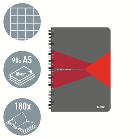 Spirálfüzet, A5, kockás, 90 lap, PP borító, LEITZ "Office", szürke-piros