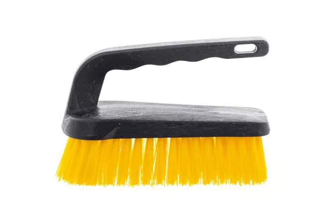 Fogantyús műanyag súroló kefe, műanyag szálakkal, nélkülözhetetlen takarítóeszköz a foltok és szennyeződések eltávolításához.