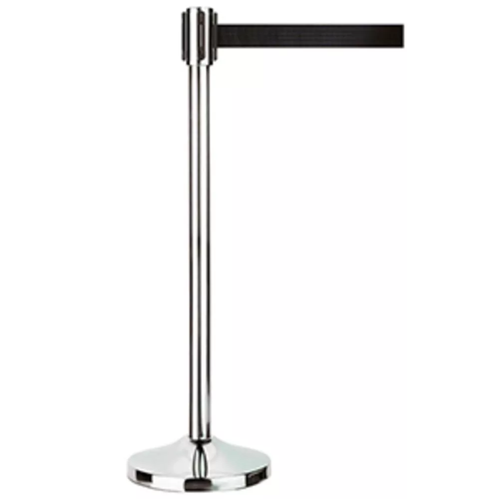 Szalagállvány, krómozott változat, fekete övvel, magasság 1 m, talp átmérője. 0,32 m, szalaghossz max. 3 méter, súly 12,5 kg