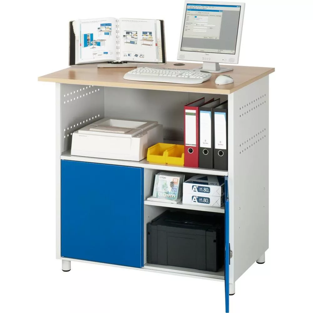 Számítógépszekrény, 25 mm vastag bükk dekorpanel, fix, 1 rekesz balra, 2 rekesz jobbra, monitorház nélkül, széxméxma 1100x800x1100 mm, ral 7035/5010