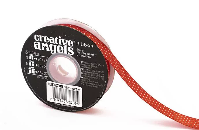 Szatén szalag, 15 mm x 22 m, piros fehér pöttyökkel