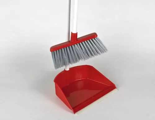 Álló szemeteslapát és kefe szett. Műanyag test, PET szálak. A szett tartalma: 1 db álló szemeteslapát, 1 db kefe nyéllel.