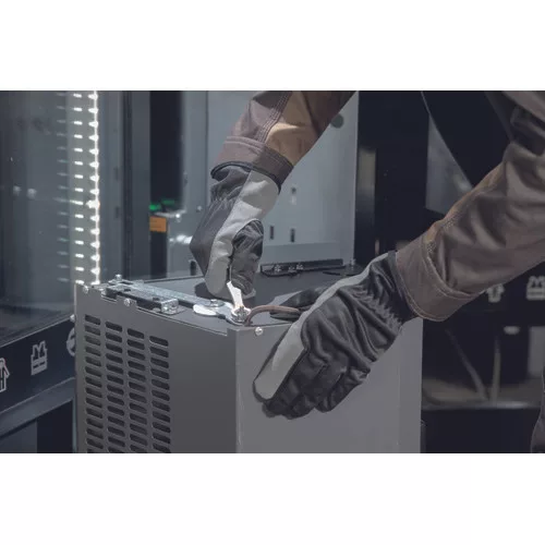 Könnyű, rugalmas kesztyű fekete poliészter hátlappal és szürke mikroszálas bőr tenyérrésszel; kiváló mechanikai tulajdonságokkal rendelkezik; kényelmes; légáteresztő; rugalmas