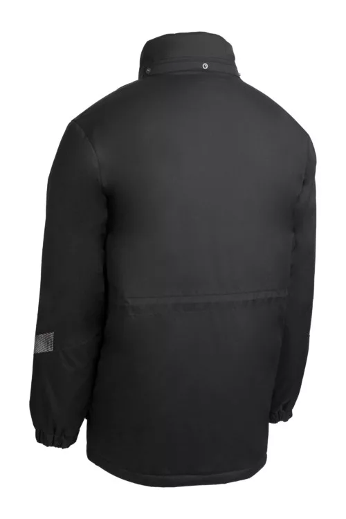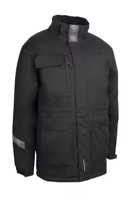 Oxford: 300D Oxford PU-val borított 100% PES + meleg bélés 160 g/m2 + Hő-visszaverő bélés * Ragasztott varrás * Állítható mandzsetta & derék * Polárral bélelt álló gallér * Kétutas cipzár dupla * Levehető bélelt kapucni * 8 zseb * Szitázható