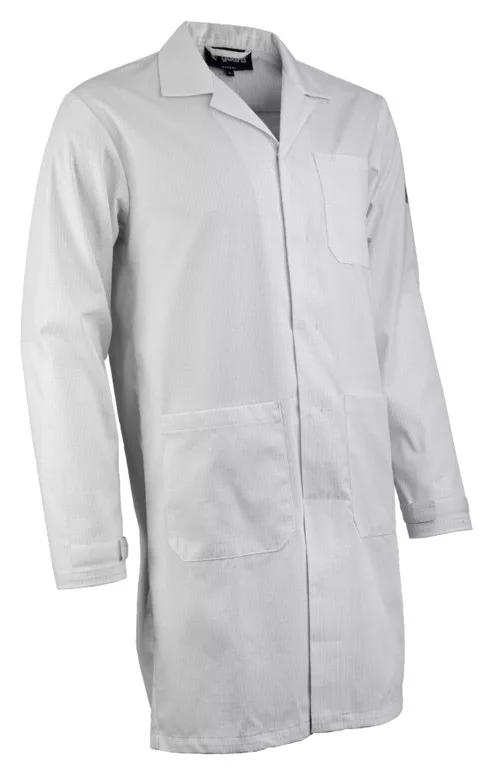 Twill (sávoly szövés): 65% poliészter / 33% pamut / 2% antisztatikus szál - 195 g/m2 * szabógallér * rejtett fém patentok * 3 zseb * hátul sliccelt ESD EN 1149-5 XS-es mérettől
