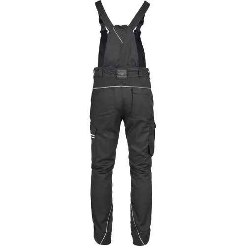 • modern szabású mellesnadrág formázott oldalvarrásokkal, állítható, rugalmas vállpántokkal, nagy, rejtett cipzáras mellzseb, zsebek mobiltelefonnak, tollaknak, rugalmas, szűkíthető derékpánt, megerősítés a térdrészen, rugalmas betétek hátul és az üleprészen, 2 D- gyűrű (nikkelmentes) a derékpánton, 2 első zseb, 2 zsebfedős oldalzseb, a bal száron extra cipzáras zseb (reflex cipzár), többfunkciós zsebek szerszámoknak, 2 farzseb, jobb oldalon zsebfedős, tépőzáras záródással, fényvisszavető részletek