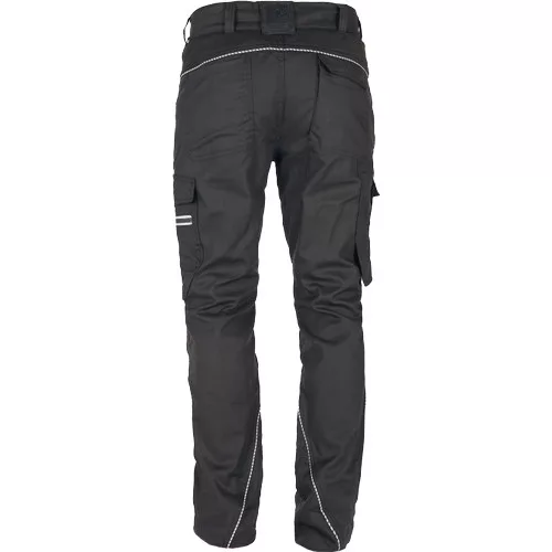 • modern szabású munkanadrág formázott oldalvarrásokkal • rugalmas derékpánt, megerősített térdrész, rugalmas betétek hátul és az üleprészen, 2 D-gyűrű (nikkelmentes) a derékpánton • 2 első zsebbel, 2 zsebfedős oldalzsebbel, a bal száron cipzáras zsebbel (reflex cipzár), többfunkciós zsebek szerszámoknak, 2 farzseb, jobb oldalon zsebfedős, tépőzáras záródással • fényvisszavető részletekkel