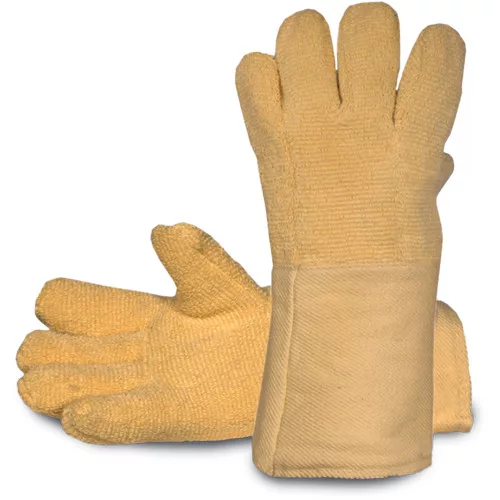 • para-aramid szövetből készült hőálló kesztyű, hurkolt kevlárszálas tenyérerősítéssel, dupla pamut béléssel • hossza: 30 cm • alkalmazási területek: forró alkatrészek kezelése, öntöde, kohászat, üvegipar, kerámia •