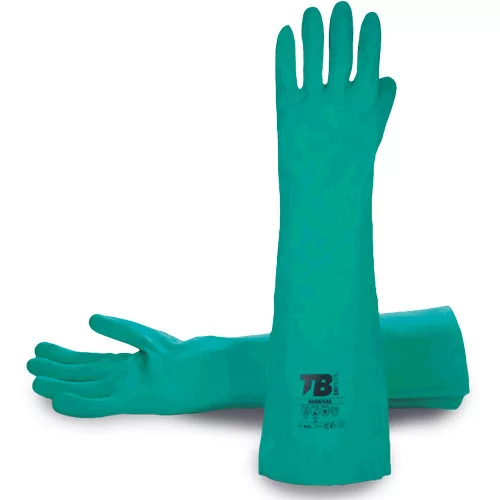 • zöld nitril kesztyű • belül fényes felület • egyenes mandzsetta • vastagság: 0,50 mm • teljes hossz: 45 cm • jól ellenáll az olajoknak, kenőanyagoknak, olaj melléktermékeknek, vegyi anyagoknak, savaknak és nem ketonos oldószereknek • klórozott belső a könnyű levehetőség érdekében • baktericid kezelés • Cat III. EN 388:2016 • EN ISO 374-1: 2016, EN ISO 374-5: 2016, EN 420: 2003+A1:2009