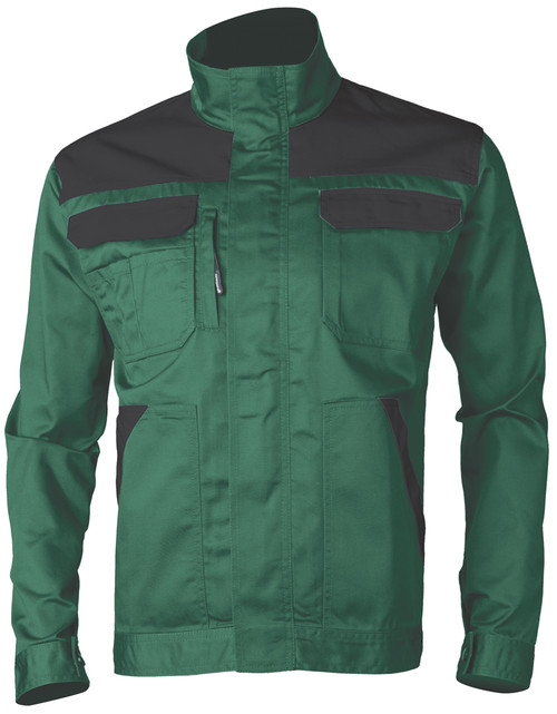 Twill (sávoly szövés): 35% pamut + 65% poliészter - 245 g/m2 vastag* Praktikus dzseki fazonú kabát* Álló gallér * Tépőzáras hajtókával fedett állig érő cipzár* Esztétikus, eltérőszínű zsebfedők, bőségráncok és betétek* Állítható derék és mandzsetta* Két oldal-, két, bőségráncos, rávarrt felső-, egy cipzáras telefon-, és három kiegészítő tartózseb* Műanyaggal bevont fém részek, szennyeződésektől védő, tépőzáras cipzárfedő* Végig erősített dupla, biztonsági varrás* Hosszított hátrész