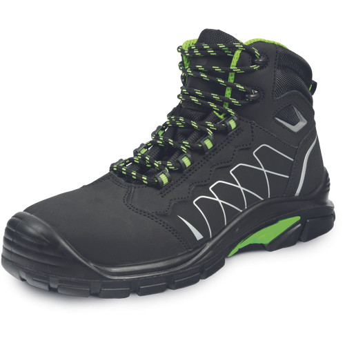 • biztonsági bakancs elősorban kültéri használatra • a fényvisszavető betétek a fokozott láthatóságért • antisztatikus PU/gumi járótalppal rendelkezik, amely kopásálló, üzemanyagálló • a felsőrész lélegző nubuk bőr vízlepergető impregnálással • a kényelmet a speciális belső talpbetétek fokozzák gélbetétekkel a sarok területén • fémmentes kivitel, kompozit lábujjvédővel és átszúrás ellen védő többrétegű textil köztalppal • második pár cipőfűző minden dobozban