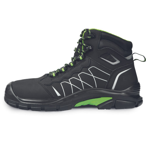• biztonsági bakancs elősorban kültéri használatra • a fényvisszavető betétek a fokozott láthatóságért • antisztatikus PU/gumi járótalppal rendelkezik, amely kopásálló, üzemanyagálló • a felsőrész lélegző nubuk bőr vízlepergető impregnálással • a kényelmet a speciális belső talpbetétek fokozzák gélbetétekkel a sarok területén • fémmentes kivitel, kompozit lábujjvédővel és átszúrás ellen védő többrétegű textil köztalppal • második pár cipőfűző minden dobozban