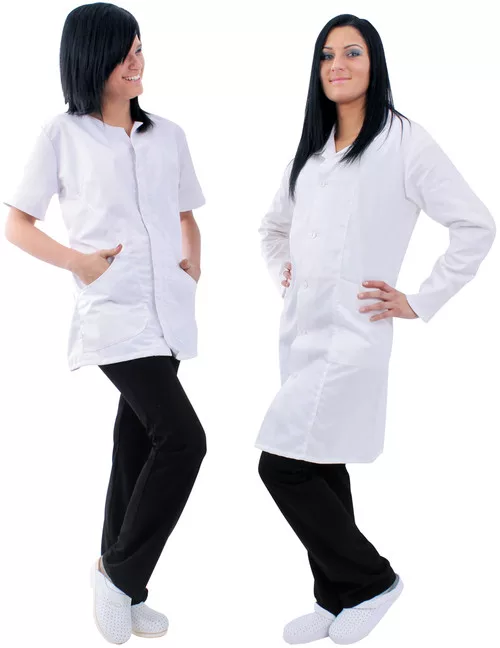 245 g/m2 vastag, lánckötésű, 65% poliészter, 35% pamut alapanyag, karcsúsított fazon, két oldalzseb, rövid ujjú, gallér nélküli, cipzáras, jól szellőző köpeny, tartós vászonból, szín: fehér