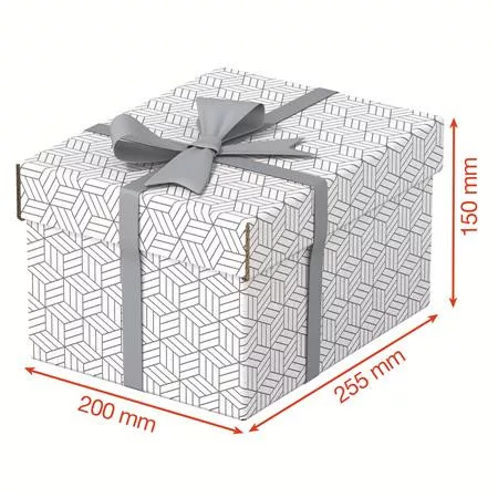 Stílusos és modern karton tárolódobozok levehető tetővel ajándékok csomagolásához vagy otthoni tároláshoz. Három azonos méretű doboz, amelyeket önállóan vagy polcokra helyezve használhat kisebb tárgyak, például fényképek és személyes dokumentumok rendezett tárolásához. Kösse át egy szalaggal és használja ajándék csomagolásához!