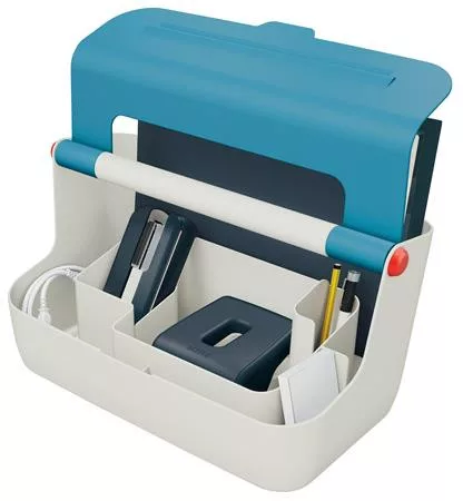 Érezd magad otthon a Leitz Cosy termékcsaláddal, bárhol is dolgozzál! A minimalista dizájnnak, matt felületnek és meleg, barátságos színvilágnak köszönhetően stílust és színt visz a munkakörnyezetedbe. -sokoldalúan használható, hordozható tárolódoboz megosztott vagy rugalmas munkakörnyezetekben, tárgyalótermekben, vagy otthon -könnyű és könnyen, egy kézzel hordozható az erős, alumíniummal megerősített fogantyúnak köszönhetően -a tető elrejti a doboz tartalmát az idegen szemek elől és rendezett megjelenést biztosít -több, kisebb rekesszel a hatékony rendszerezés és az eszközök gyors elérése érdekében, valamint egy nagyobb rekesszel - A4 lapok tárolásához -okostelefon / táblagép elhelyezésére alkalmas perem, mely mindig szem előtt tartja okos eszközeidet -tartós ABS anyagból, mely ellenáll a mindennapi használatnak és könnyen tisztítható -nagy tárolási kapacitású, mégis kis helyigényű, így a legtöbb zárható szekrényben elfér minimál dizájn, matt felület és meleg, hívogató színvilág -műanyagmentes csomagolás -méret: 214 x 196 x 367 mm