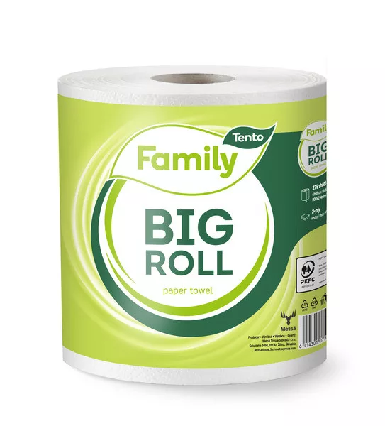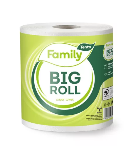 A Tento Family Big Roll háztartási papírtörlő hosszan tartó megoldást kínál extra hosszú tekercsével és jó nedvszívó képességével, így ideális a mindennapi otthoni feladatokhoz. A Tento Family termékcsalád azoknak készült, akik egyszerű és megbízható higiéniai megoldásokat keresnek otthonuk számára. PEFC- és FSC-tanúsítvánnyal rendelkezik.