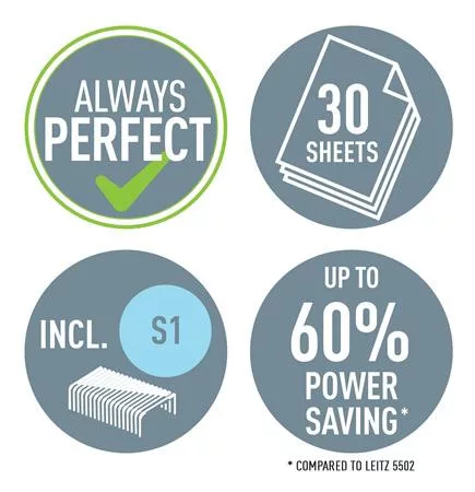 megbízható tűzőgép mindennapos használatra a szabadalommal védett Softpress könnyített tűzés technológiának köszönhetően a tűzőgép felülete bárhol lenyomható a tűzéshez, így könnyen, megerőltetés nélkül tűzhetünk a kézi vagy asztali használat során a hagyományos Leitz tűzőgépekhez képest a tűzés 60%-kal kisebb erőkifejtést igényel a lapos tűzés technológia a tűzés helyén laposabb papírkupacok által 40%-os helymegtakarítást eredményez a szabadalommal védett Direct Impact technológia és Leitz Softpress tűzőkapcsok tökéletes tűzést biztosítanak minden alkalommal Max. 30 lap tűzéséhez (80 g-os) 10 év garancia Leitz tűzőkapcsok használata esetén