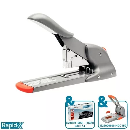 - robosztus, elöltöltős, nagyteljesítményű tűzőgép emelőkaros szerkezettel a nagy tűzési kapacitás érdekében - tökéletes postai és irodai munkához - kapacitás: 110 lap - tűzési mélység: 66 mm - javasolt kapocs: 9/8-14 Superstrong (E24870900, E24871000, E24871100, E24871200, E24871300, E24871400, E24871500) - alkalmas zárt tűzésre - kényelmes utántöltés az elöltöltős szerkezettel - 5 év garancia Rapid tűzőkapcsok használata esetén - javasoljuk hozzá az HDC150 lyukasztót