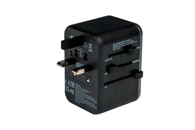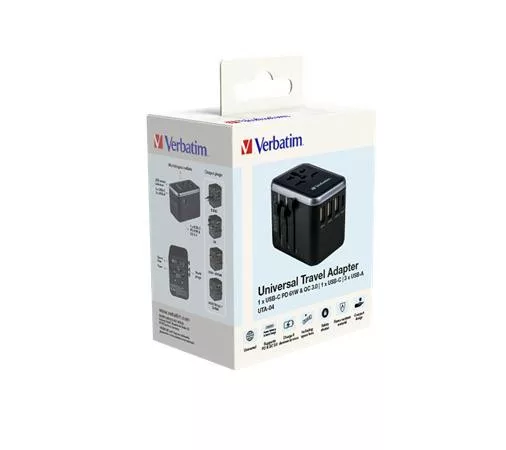 A Verbatim univerzális utazási adapter több mint 180 országban használható: a világ bármely helyi tápegységéhez csatlakozhat, és újratöltheti energiaigényes eszközeit, például laptopjait és fényképezőgép-akkumulátorait. Az alján található USB-C és USB-A portok segítségével feltöltheti bármilyen USB-eszközét.