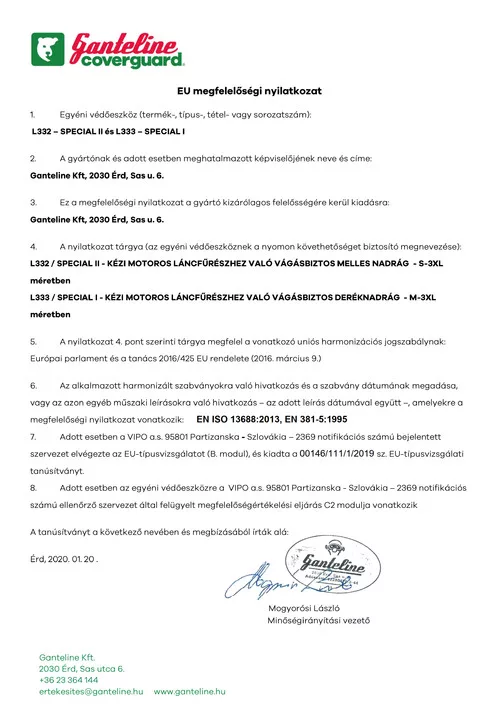* kopásálló poliészter és szellőző pamut alapanyagok keveréke * az elejerészeken, a vállaknál és az ujjakon kilenc rétegű, aramidszálas vágásvédő betét * véd 20 m/s láncsebességű láncfűrész által okozott vágó hatás ellen* zöld színben, narancs rátéttel, két zsebbel, övbújtatókkal