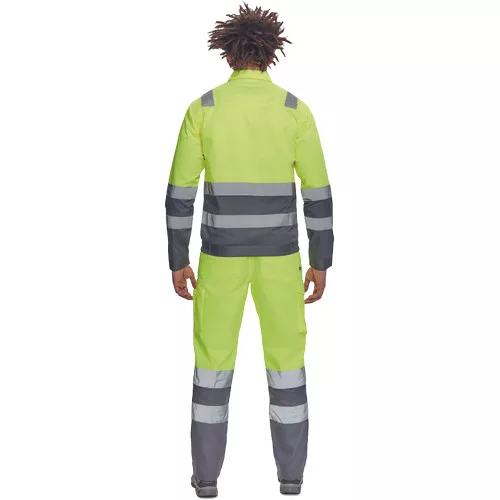 • férfi Hi-Vis kabát 5 cm széles fényvisszavető csíkokkal • tépőzáras hajtókával fedett cipzár • 2 nagy zsebfedős mellzseb • rugalmas oldalsó betétek az alsó szegélyen • tépőzáras mandzsetta
