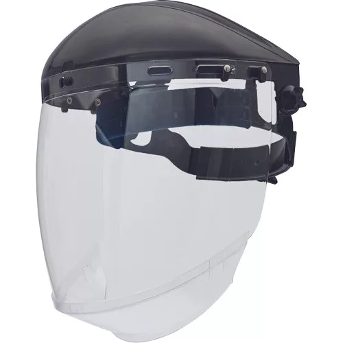 »Víztiszta, 1AT osztályú polikarbonát arcvédő homlokvédővel, ABS fejrésszel, amely az áll környékén fokozott védelmet biztosít. Nagy energiájú, nagy sebességű részecskék, olvadt fém és forró szemcsék ellen véd. Súly: 380 g