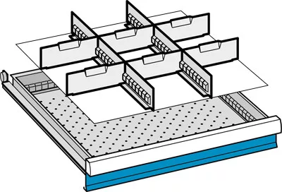Válaszfalak, elülső magasság 100 mm, 2 db 27e résfal, 6 db 9e elválasztó, hasznos fiókméret szé x mé 459x459 mm